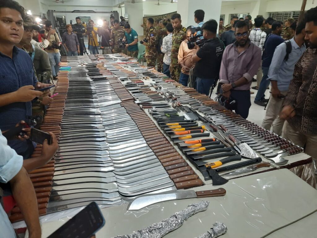 রাজধানীর নিউ মার্কেট এলাকায় অভিযান চালিয়ে প্রায় ১১০০ এর বেশী দেশীয় ধারালো অস্ত্র উদ্ধার করেছে সেনাবাহিনী। উদ্ধার হওয়া অস্ত্রের মধ্যে রয়েছে সামুরাই, চাপাতিসহ বিভিন্ন ধরনের ধারালো ছুরি যা সন্ত্রাসী কার্যক্রমে ব্যবহৃত হতো।