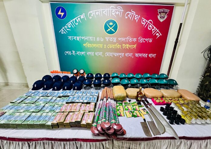 অভিযানে ১৩টি তাজা ককটেল বোমা, ২৫টি আধা প্রস্তুত ককটেল, ৪০০ গ্রাম গানপাউডার, ২টি সামুরাই তলোয়ার, ১২টি হকিস্টিক, ২৯টি হেলমেট, ২টি ড্রাগন লাইট, ১১ কেজি গাঁজা, ১২ প্যাকেট হেরোইন, নগদ ১ কোটি ১৩ লক্ষ টাকা এবং একটি টাকা গণনার মেশিন উদ্ধার করা হয়।