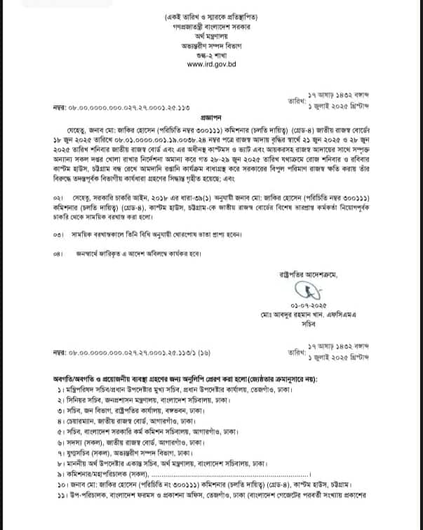 রাষ্ট্রপতির আদেশক্রমে এনবিআর চেয়ারম্যান আব্দুর রহমান খান কর্তৃক স্বাক্ষরিত এক আদেশে এ তথ্য জানানো হয়েছে।”