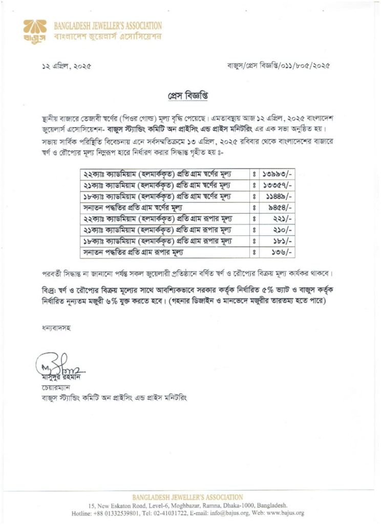 শনিবার (১২ এপ্রিল) বাংলাদেশ জুয়েলার্স সমিতি (বাজুস) এক সংবাদ বিজ্ঞপ্তিতে সোনার দাম বাড়ার কথা জানায়। এতে বলা হয়েছে, স্থানীয় বাজারে তেজাবি সোনার (পিওর গোল্ড) দাম বেড়ে যাওয়ায় দাম সমন্বয় করা হয়েছে। নতুন দাম আগামীকাল রোববার থেকে কার্যকর হবে।’