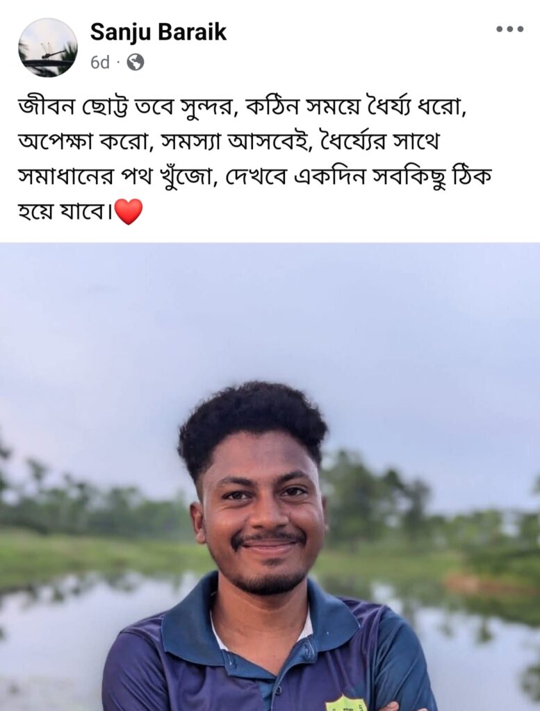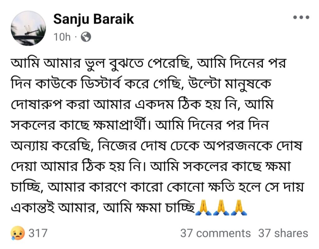 সঞ্জু মৃত্যুর আগে তার ফেসবুক প্রোফাইলে একটি স্ট্যাটাস দেন, যেখানে অনুশোচনা আর ক্ষমা চাওয়ার ছাপ স্পষ্ট।”