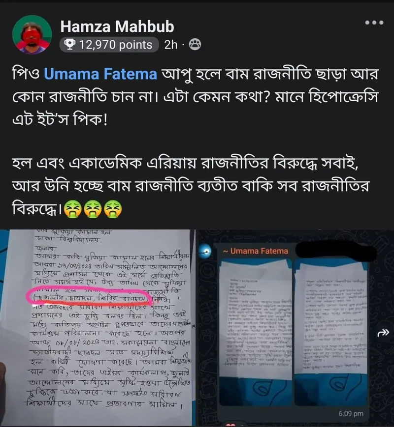 দরখাস্তে উমামা উল্লেখ করেন, ২০২৪ সালের ১৭ জুলাই সম্মিলিত আন্দোলনের মাধ্যমে সুফিয়া কামাল হলে সব ধরনের রাজনীতি (ছাত্রলীগ, ছাত্রদল, শিবির, বাগছাস) নিষিদ্ধ করার প্রতিশ্রুতি পাওয়া গিয়েছিল। তার দাবি, গত এক বছরে এই চুক্তি বহাল থাকলেও সম্প্রতি ছাত্রদল হলে সাত সদস্যবিশিষ্ট কমিটি ঘোষণা করেছে, যা ওই চুক্তি ভঙ্গের শামিল।’