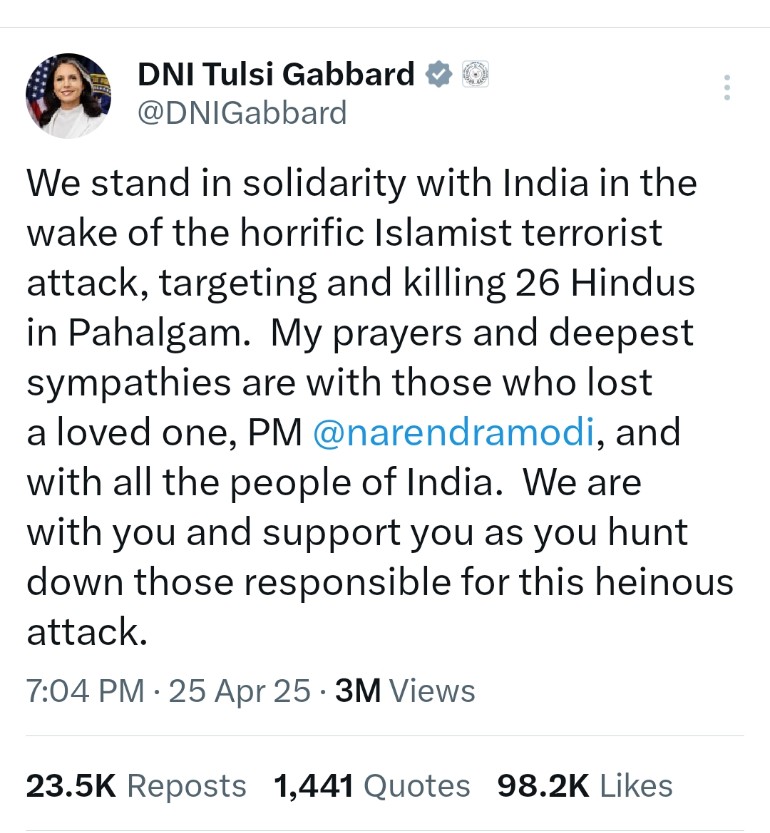 ‘ওই বার্তায় দিল্লির প্রতি ওয়াশিংটনের পুরো সমর্থন আছে উল্লেখ করে মার্কিন গোয়েন্দাপ্রধান মোদিকে উদ্দেশ করে বলেছেন, হিন্দুদের হত্যাকারী ভয়াবহ ইসলামপন্থী সন্ত্রাসী হামলার প্রেক্ষাপটে যুক্তরাষ্ট্র ভারতের সঙ্গে সংহতি প্রকাশ করছে।’