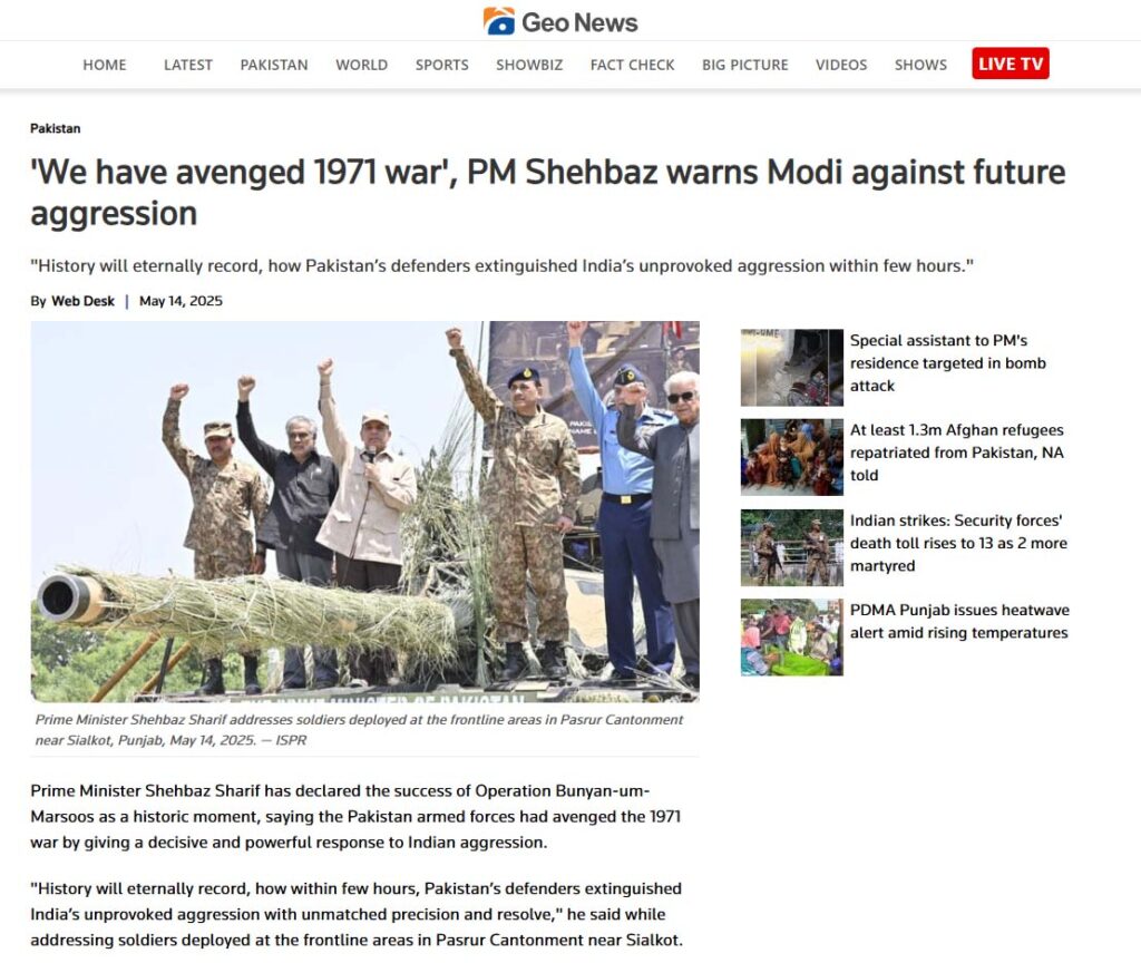 ◆ভারতের বিরুদ্ধে সাম্প্রতিক পাল্টা হামলা চালিয়ে কয়েক ঘণ্টার মধ্যে তাদের সেনাদের নাস্তানাবুদ করে দেয় পাকিস্তান। এর মাধ্যমে ভারতের বিরুদ্ধে পাকিস্তান ১৯৭১ সালের যুদ্ধের প্রতিশোধ নিয়েছে বলে মন্তব্য করেছেন পাকিস্তানের প্রধানমন্ত্রী শেহবাজ শরিফ।‘