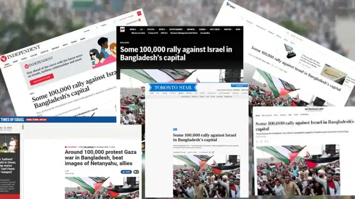 ওয়াশিংটন পোস্টের শিরোনামে বলা হয়েছে, ‘বাংলাদেশের রাজধানীতে ইসরায়েলের বিরুদ্ধে প্রায় ১ লাখ মানুষের সমাবেশ। সংবাদমাধ্যম ফাস্টপোস্টের প্রতিবেদনে বলা হয়েছে, ‘আন্তর্জাতিক সংঘাতের কারণে সৃষ্ট জাতীয় সংকট : গাজায় ইসরায়েলি হামলার বিরুদ্ধে বাংলাদেশে হাজারো মানুষের সমাবেশ।’