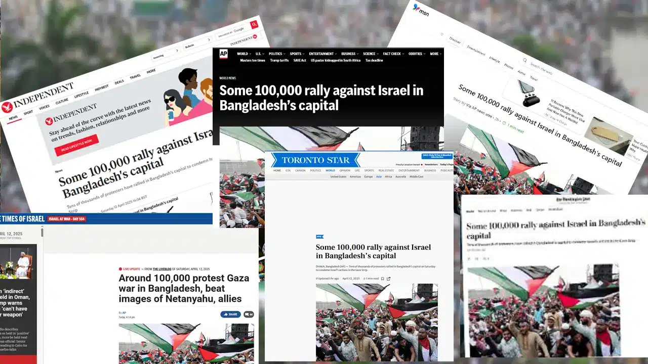 বার্তাসংস্থা এপির প্রতিবেদনে বাংলাদেশের রাজধানীতে ইসরায়েলের বিরুদ্ধে লাখো মানুষের বিক্ষোভ শীর্ষক শিরোনাম করা হয়েছে।এতে বলা হয়েছে, ‘গাজা উপত্যকায় ইসরায়েলের কর্মকাণ্ডের নিন্দা জানাতে শনিবার বাংলাদেশের রাজধানীতে হাজার হাজার বিক্ষোভকারী সমাবেশ করেছেন।’