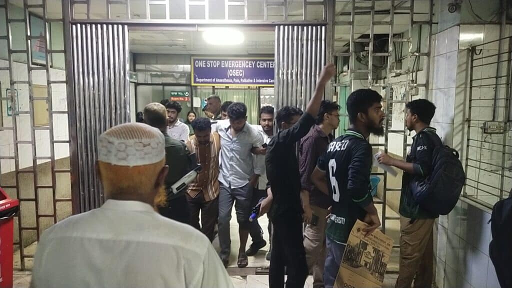 ▪বিষয়টি নিশ্চিত করেছেন ঢামেক হাসপাতালের পুলিশ পরিদর্শক মো.ফারুক।তিনি বলেন, যমুনা অভিমুখে লং মার্চে অংশ নেওয়া জগন্নাথ বিশ্ববিদ্যালয়ের শিক্ষার্থীরা পুলিশের লাঠিচার্জে আহত হলে তাদের জরুরি বিভাগে নিয়ে আসা হয়।বর্তমানে তাদের চিকিৎসা দেওয়া হচ্ছে। এই ঘটনায় শিক্ষার্থী সাংবাদিকসহ ৩৮ জন আহত হয়েছে। বেশিরভাগ শিক্ষার্থী চিকিৎসা নিয়ে চলে গেছেন।’