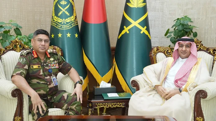 বাংলাদেশ সেনাবাহিনী প্রধান জেনারেল ওয়াকার-উজ-জামানের সঙ্গে সৌজন্য সাক্ষাৎ করেছেন ঢাকায় নবনিযুক্ত সৌদি রাষ্ট্রদূত ড. আব্দুল্লাহ জাফের বিন আবিয়া। বুধবার (৬ আগস্ট) সেনা সদর দফতরে এই বৈঠক অনুষ্ঠিত হয়।