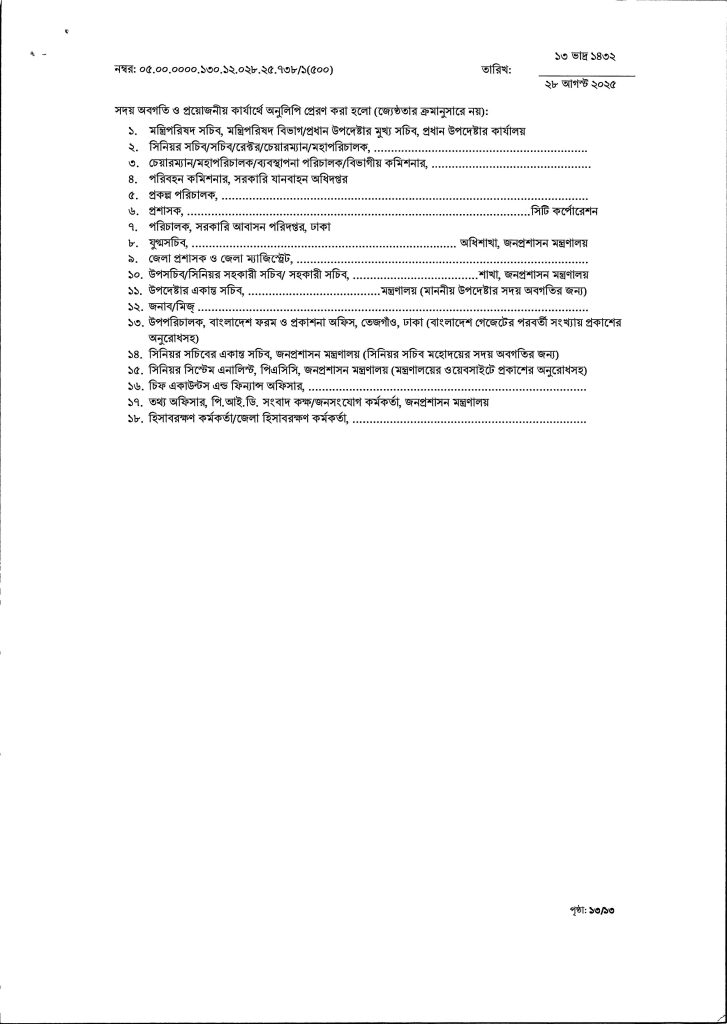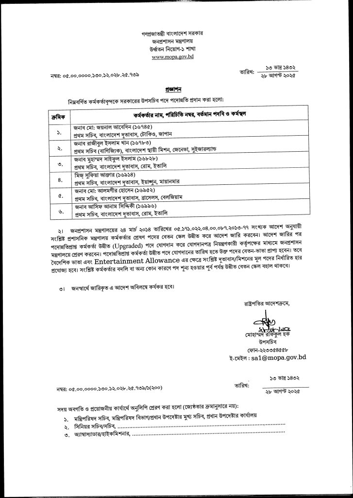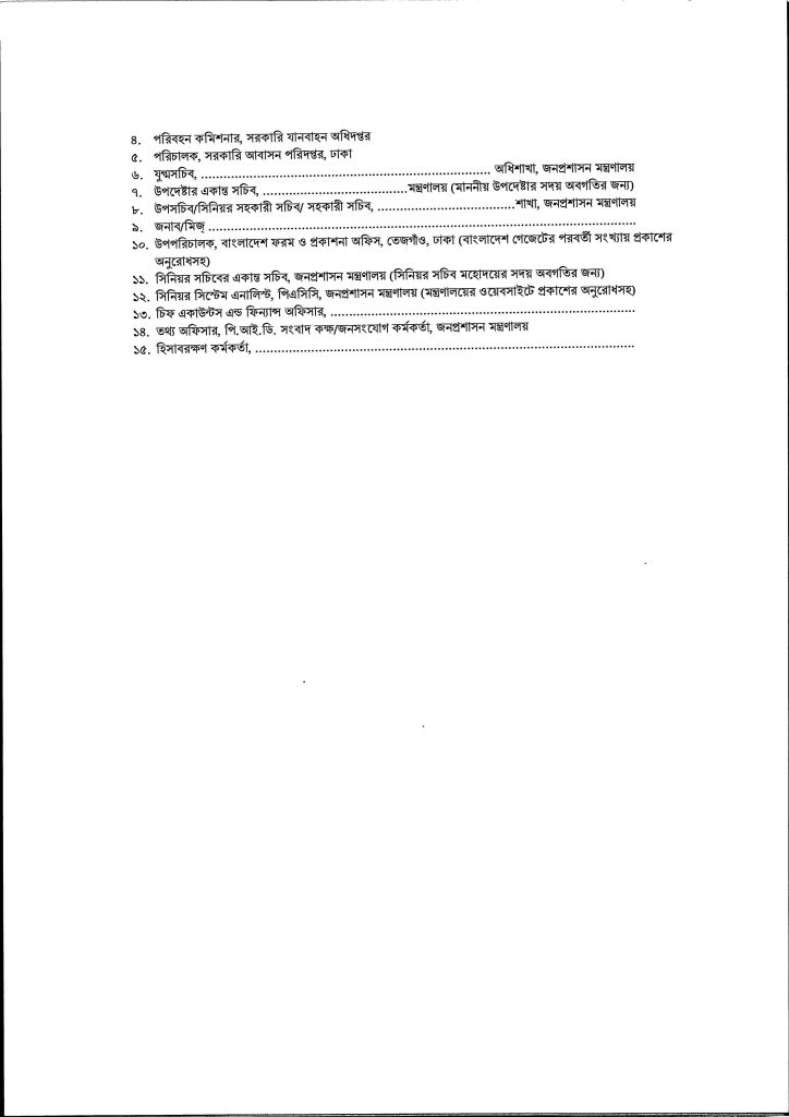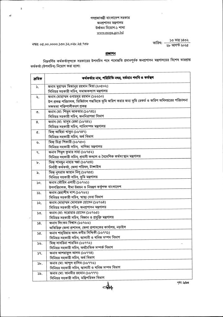 প্রজ্ঞাপনে উল্লেখ করা হয়, পদোন্নতিপ্রাপ্ত কর্মকর্তাদের উপসচিব পদে পদোন্নতি প্রদানপূর্বক জনপ্রশাসন মন্ত্রণালয়ের বিশেষ ভারপ্রাপ্ত কর্মকর্তা (উপসচিব) হিসেবে নিয়োগ দেওয়া হয়েছে।