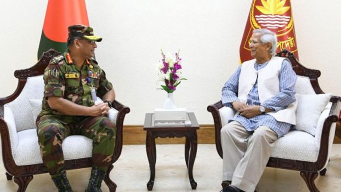 প্রধান উপদেষ্টার উপ-প্রেস সচিব আবুল কালাম আজাদ মজুমদার এক বিবৃতিতে জানান, সাক্ষাৎকালে দেশের বর্তমান পরিস্থিতি ও বেসামরিক প্রশাসনকে সহায়তায় সেনাবাহিনীর ভূমিকা নিয়ে আলোচনা হয়। প্রধান উপদেষ্টা আইনশৃঙ্খলা রক্ষায় ধারাবাহিক অবদানের জন্য সেনাবাহিনীকে ধন্যবাদ জানান।”