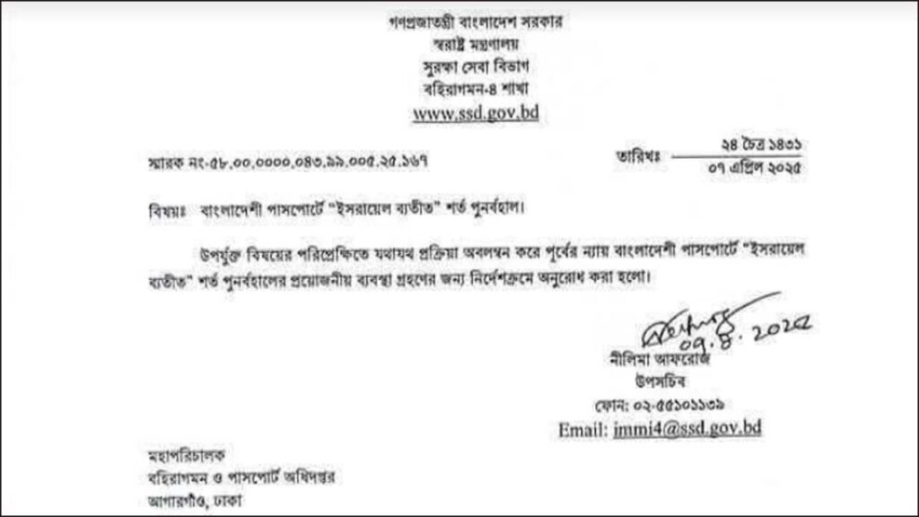 ”স্বরাষ্ট্র মন্ত্রণালয়ের সুরক্ষা সেবা বিভাগের উপ-সচিব নীলিমা আফরোজ বলেন, ‘পাসপোর্টে নতুন করে ‘এক্সসেপ্ট ইসরায়েল’ বিষয়টি পূর্ণবহাল করা হয়েছে। এ নিয়ে গত ৭ এপ্রিল একটি প্রজ্ঞাপন জারি করা হয়েছে।স্বরাষ্ট্র মন্ত্রণালয়ের সুরক্ষা সেবা বিভাগের উপ-সচিব নীলিমা আফরোজ বলেন, ‘পাসপোর্টে নতুন করে ‘এক্সসেপ্ট ইসরায়েল’ বিষয়টি পূর্ণ