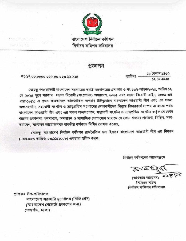 আওয়ামী লীগের নিবন্ধন স্থগিত করে নির্বাচন কমিশনের প্রজ্ঞাপন জারি।