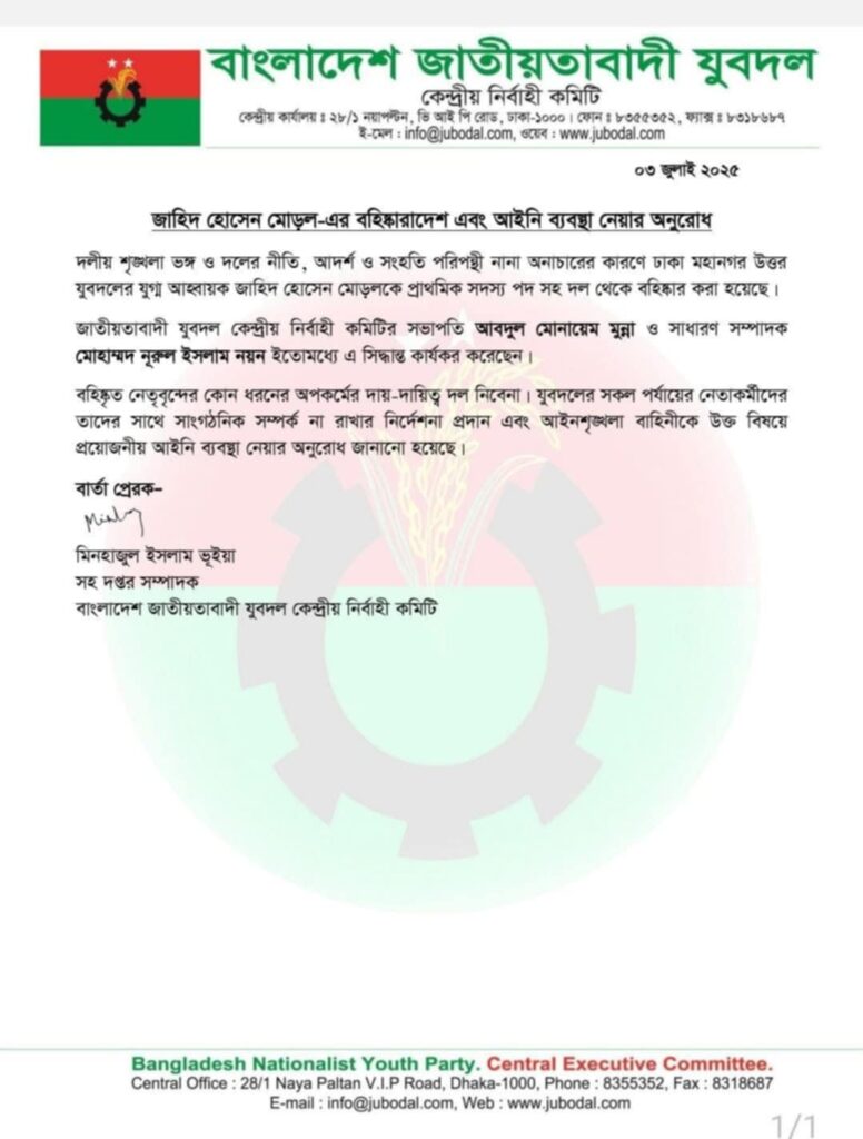 বহিষ্কারের এই সিদ্ধান্তে স্বাক্ষর করেছেন যুবদল কেন্দ্রীয় কমিটির সভাপতি আব্দুল মোনায়েম মুন্না ও সাধারণ সম্পাদক মোহাম্মদ নূরুল ইসলাম নয়ন। সিদ্ধান্তটি অবিলম্বে কার্যকর করার কথাও জানানো হয়েছে।”