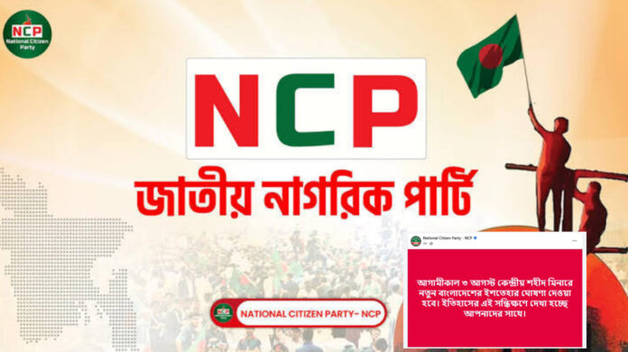 জাতীয় নাগরিক পার্টি (এনসিপি) আগামীকাল ৩ আগস্ট কেন্দ্রীয় শহীদ মিনারে “নতুন বাংলাদেশের ইশতেহার” ঘোষণা করবে। শনিবার (২ আগস্ট) সকালে দলটির অফিসিয়াল ফেসবুক পেজে এক পোস্টের মাধ্যমে এই তথ্য জানানো হয়েছে।