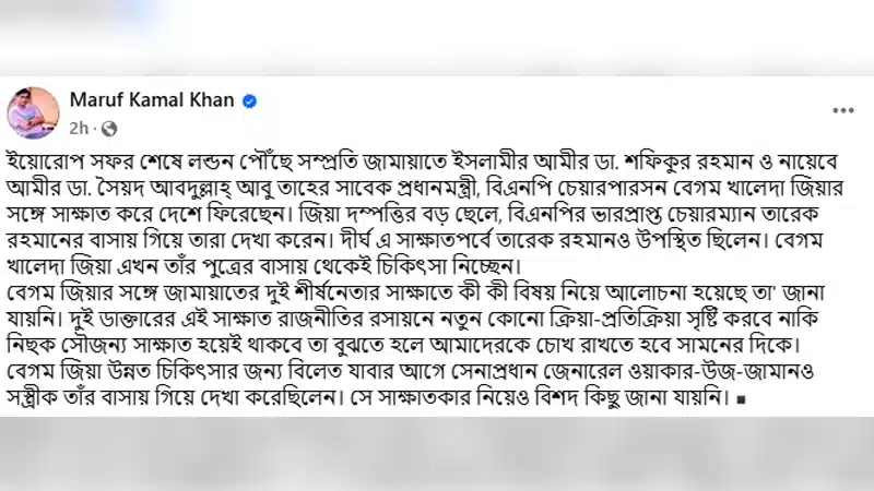পোস্টে তিনি লেখেন, ‘ইউরোপ সফর শেষে লন্ডন পৌঁছে সম্প্রতি জামায়াতে ইসলামীর আমির ডা.শফিকুর রহমান ও নায়েবে আমির ডা.সৈয়দ আবদুল্লাহ্ আবু তাহের সাবেক প্রধানমন্ত্রী, বিএনপি চেয়ারপারসন বেগম খালেদা জিয়ার সঙ্গে সাক্ষাৎ করে দেশে ফিরেছেন।জিয়া দম্পতির বড় ছেলে, বিএনপির ভারপ্রাপ্ত চেয়ারম্যান তারেক রহমানের বাসায় গিয়ে তারা দেখা করেন। দীর্ঘ এই সাক্ষাৎপর্বে তারেক রহমানও উপস্থিত ছিলেন। বেগম খালেদা জিয়া এখন তার পুত্রের বাসায় থেকেই চিকিৎসা নিচ্ছেন।’